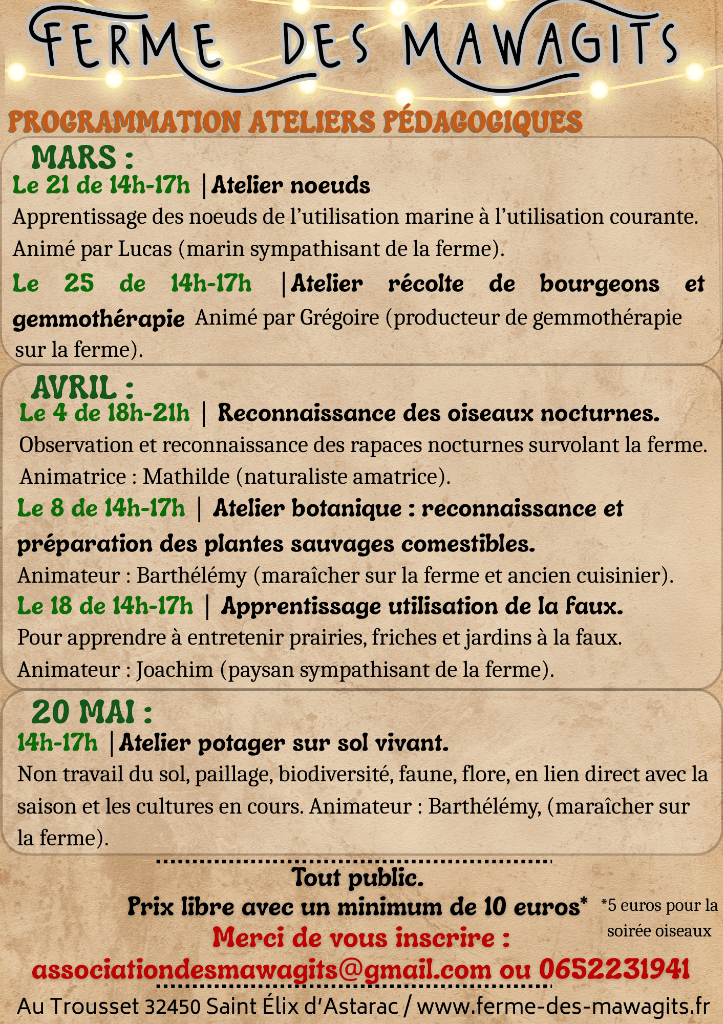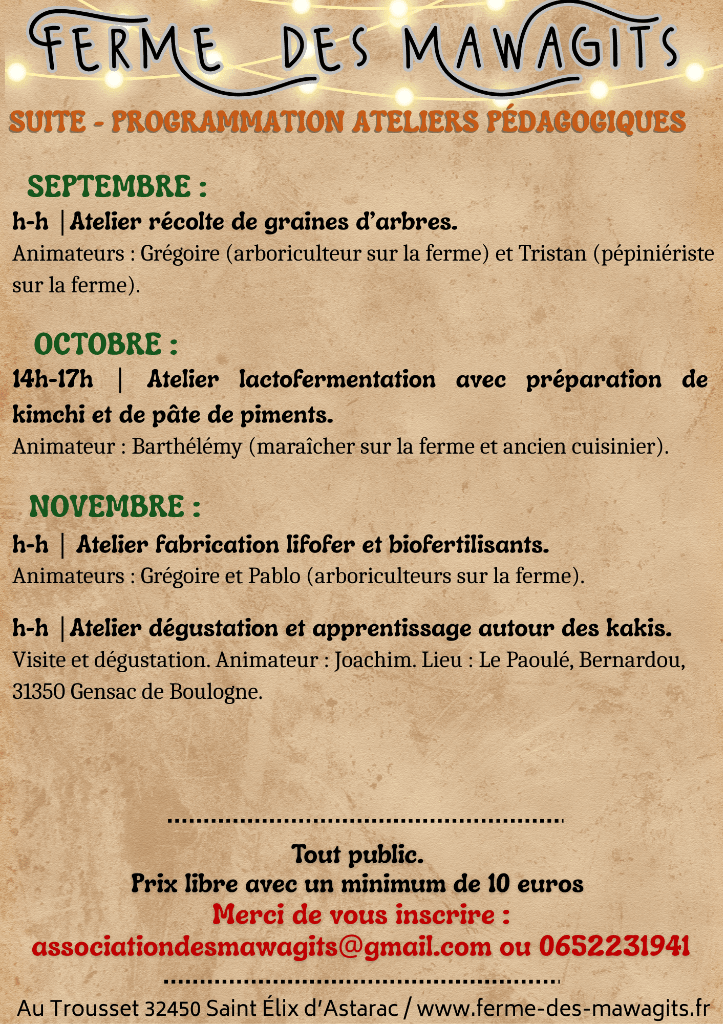 Afin de mettre en lumière le travail d’agriculteur·ices pionnières et pionniers mais aussi de partager nos propres expériences, nous organisons des événements agricoles à la ferme. Stages de greffe collectif avec échanges de greffons quel que soit ton niveau d’expérience, visites guidées de la ferme et repas champêtre, formations à l’agroforesterie, plantation de haies champêtre avec l’association Arbres et Paysages 32 afin de replanter notre cher bocage gersois…